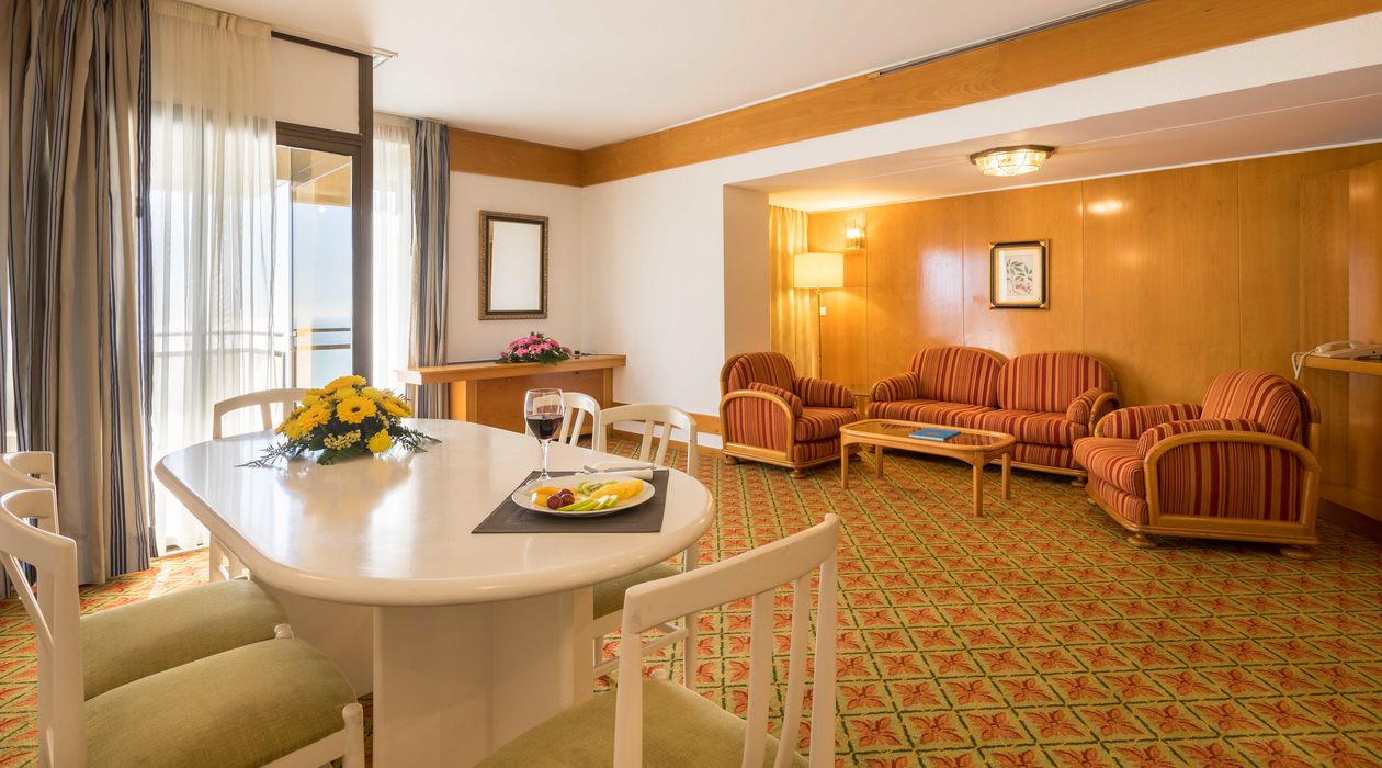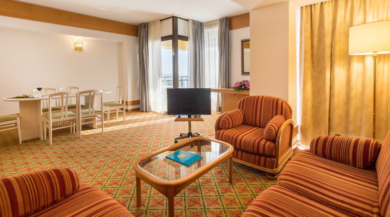Located on the 14th floor, it has a spacious living room, equipped kitchen, bedroom and bathroom with hairdryer and amenities. Rooms with double bed (Queen size bed and possibility of placement of crib), TV, telephone with wake-up service, safe (for a fee), chest of drawers and balcony. Living room with sofa bed, armchairs and possibility of placing extra bed, desk, completely soundproofed, dining table, LCD, air conditioning, telephone, free wi fi and balconies.
